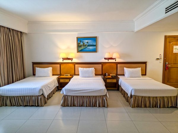 - Three Beds: The room is equipped with three comfortable beds, which can be arranged as one king-size bed and one single bed or three single beds, depending on your preference.